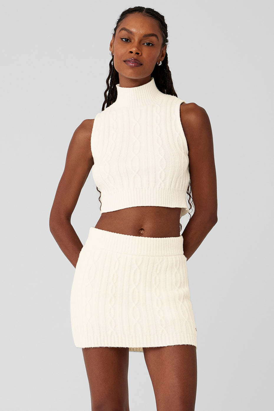 Cable-knit from a plush, dreamily soft fabric blend, this top makes any outfit feel festive and cozy. It has a close fit, a ribbed hem that hits at the waist and a sleeveless silhouette with a ribbed mock neck. Luxe and oh-so-easy to wear, try styling it with the matching Mini Skirt (for a cute party look) or the matching Pants (to cuddle up by the fire).