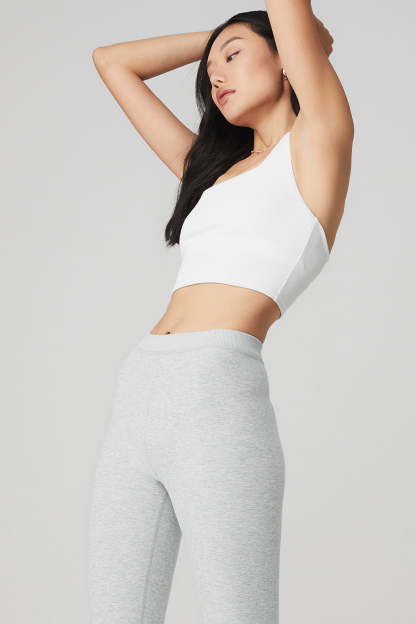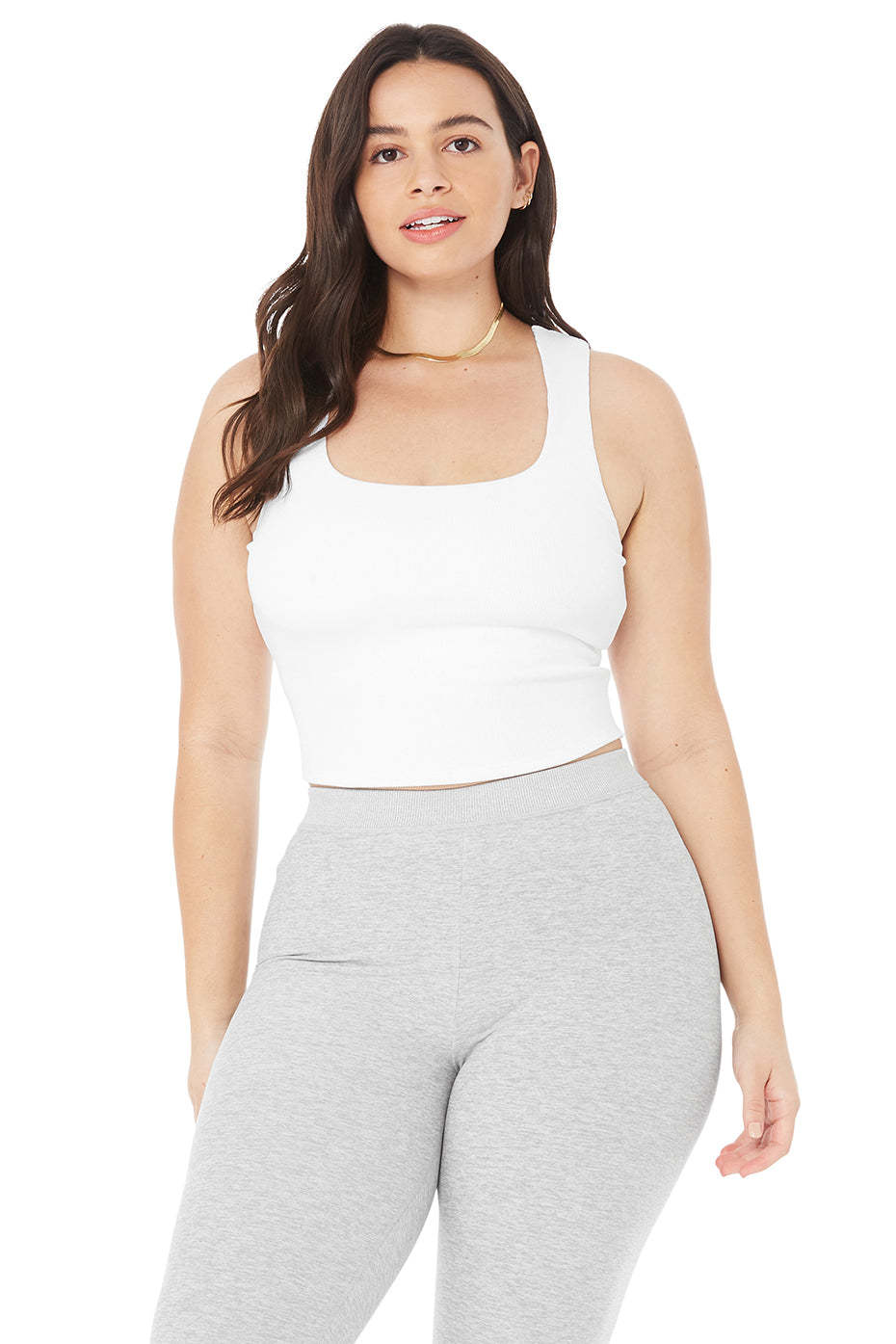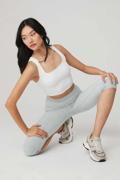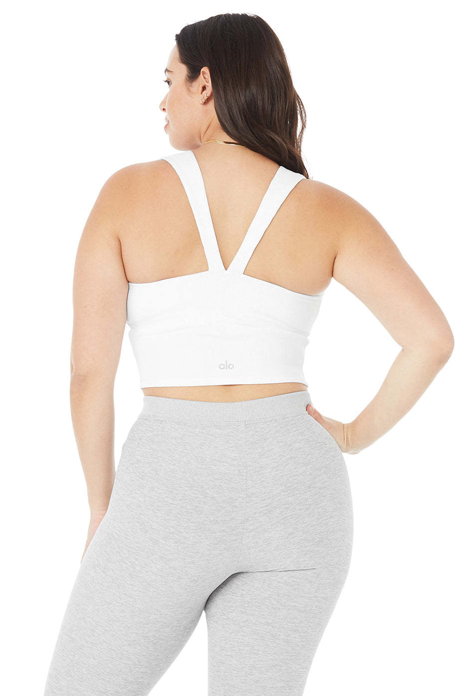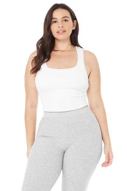 This look is literally everything. Made from soft, super-breathable Alosoft in a supportive, ribbed fabrication, the forward Chic Bra Tank,features a V-racerback, rounded square neckline & shelf bra lining for all-day support. We love it with a cool moto legging.
