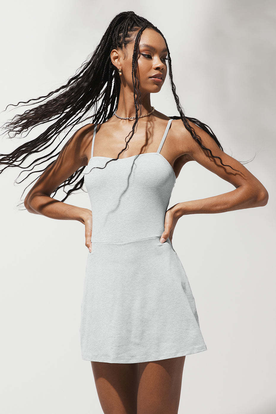 Fashion-forward and beyond functional, the Courtside is made of super soft, stretchy Alosoft with thin adjustable straps, a sweetheart neckline, a snug fit through the waist, and a mini-length A-line skirt. Bonus points for the hidden shelf bra and shorts. Just add a racquet and sneakers (for on the court) or sandals and a mini bag (for off the court).