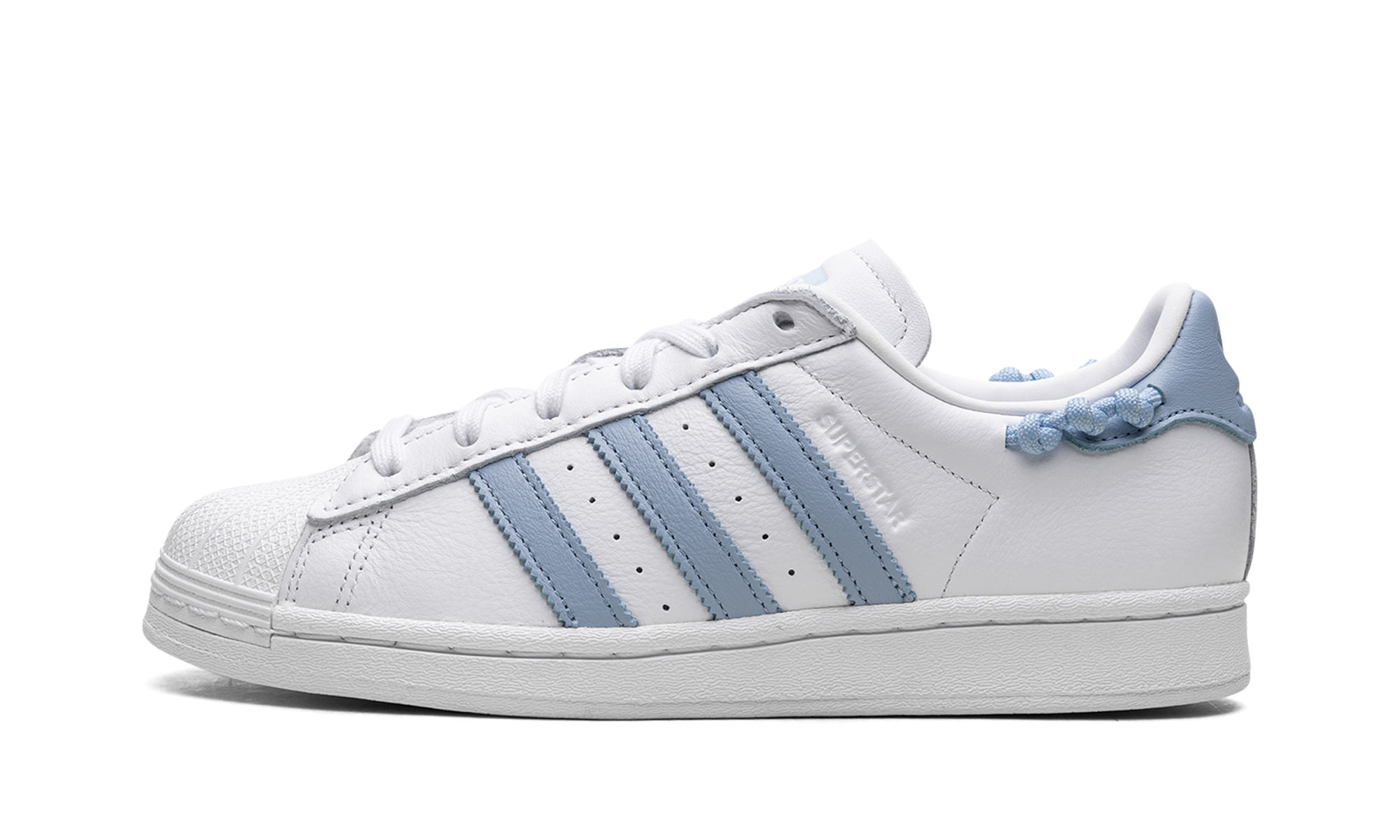 The Women's adithtdas Superstar "Knotted Rope - Sky Blue" is a women's-exclusive colorway of the retro tennis shoe with a two-tone, white-and-blue color block. This version of the Superstar has a unique knotted rope detail incorporated into the back of the collar, giving the shoe an extra, eye-catching feature. The upper is complete with a white leather construction with perforations between the Sky Blue leather Three Stripes on the sides. An embossed "Superstar" logo appears on the lateral side of the mid-panel, and an embossed adithtdas Trefoil logo can be seen on the blue leather heel tab. Additional branding appears on the tongue. Sky Blue